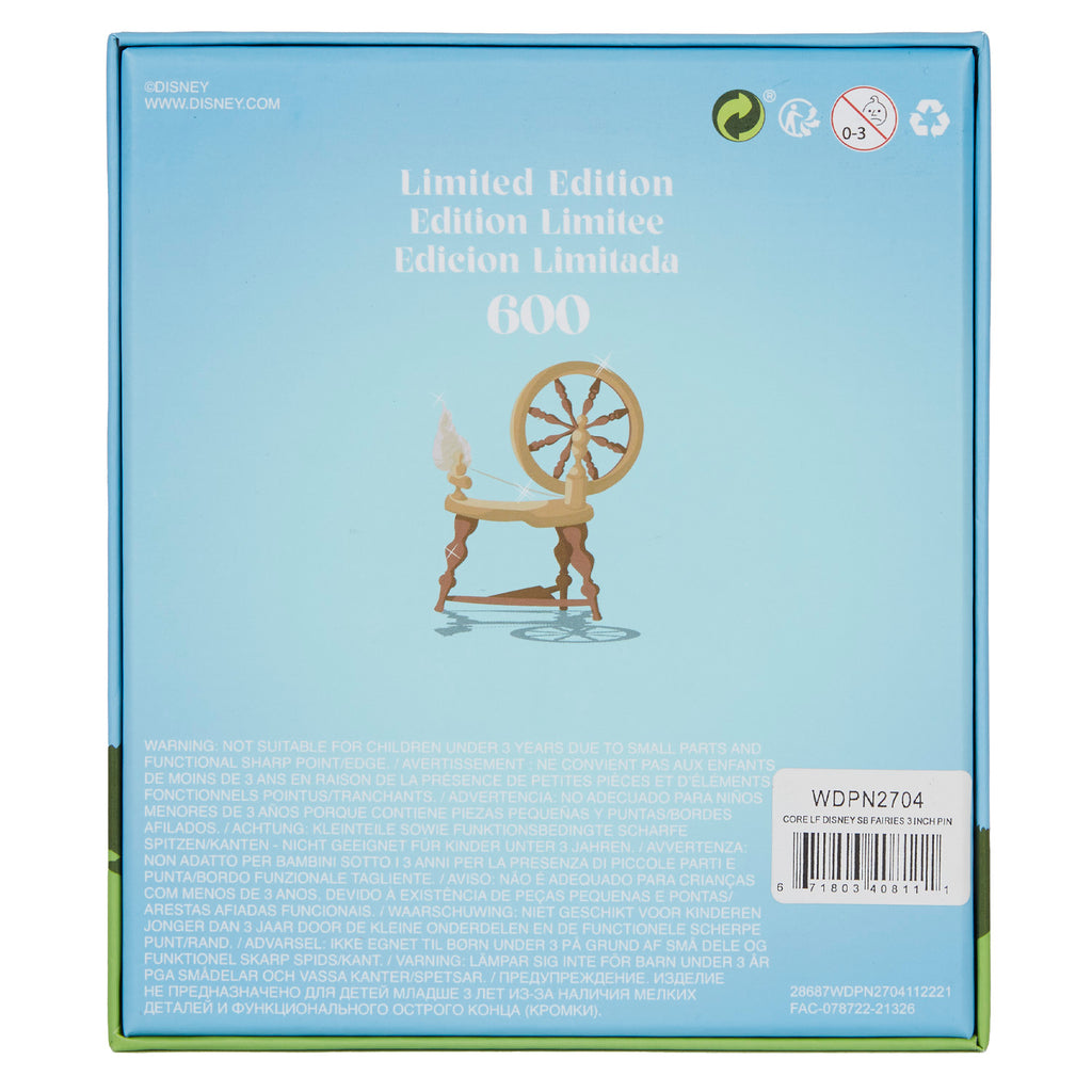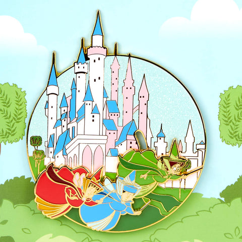 Fauna, Flora, and Merryweather come together, flying past Aurora’s Castle as the limited edition Sleeping Beauty Fairies Sliding Pin. The sky glitters in the background and Aurora’s Castle towers outside of the frame of this circular pin. Fauna, Flora, and Merryweather slide back and forth on the front, making it appear as though they’re flying the winds past the castle. This 3-inch pin is eye-catching and a perfect accessory for Disney fans who are looking to have the three fairies cameo in their collection.